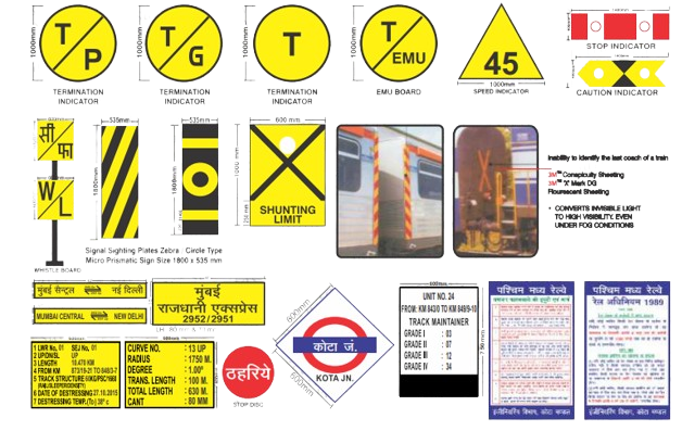 Railway sign boards are critical safety and information systems used across railway stations, tracks, yards, crossings, and maintenance zones to ensure safe train operations and passenger movement. These sign boards are designed and installed in accordance with prescribed railway safety norms and signaling standards to communicate warnings, mandatory instructions, operational guidance, and public information. Railway sign boards include indicators for level crossings, speed restrictions, platform information, danger zones, overhead electrical equipment warnings, trespassing prohibitions, and emergency instructions. Manufactured using heavy-duty materials such as aluminum sheets with high-intensity retro-reflective or photoluminescent coatings, these boards are engineered for maximum visibility under varying light conditions, high-speed train environments, and extreme weather exposure. Their standardized symbols, clear typography, and durable construction support operational safety, reduce accident risks, and enhance compliance with railway safety regulations while ensuring clear communication for both railway personnel and the general public.